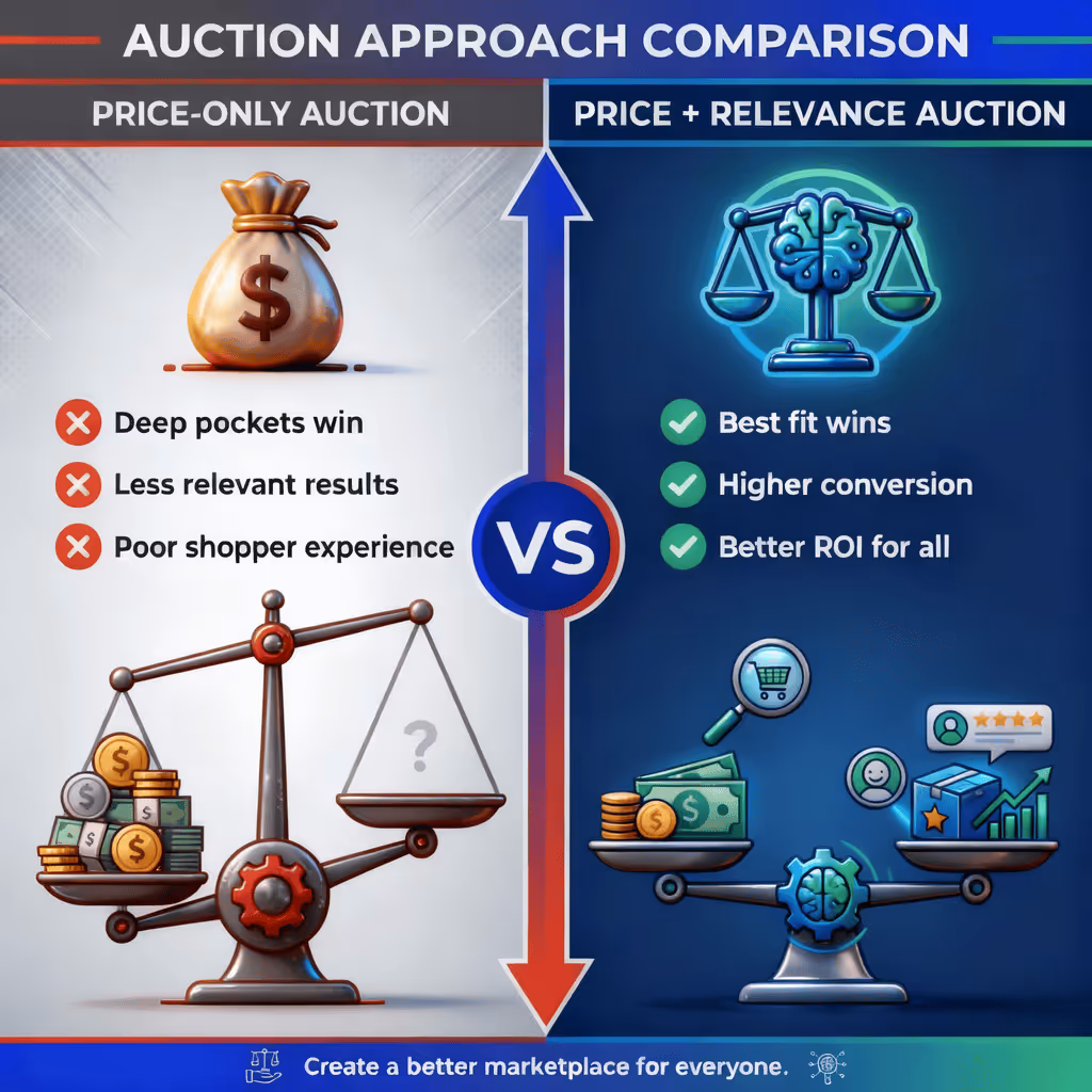 Pure price-based auctions create a problem: they reward deep pockets, not relevance. A well-funded brand can outbid everyone and show shoppers products they don't actually want. That's bad for the shopper, bad for the retailer's conversion rates, and ultimately bad for the advertiser's ROI.