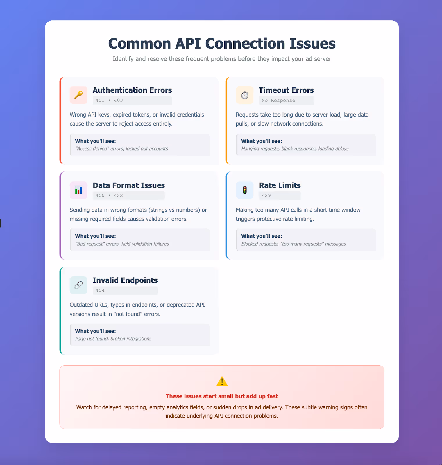 APIs power most of what an ad server does behind the scenes. But like all things that depend on internet connections and external systems, they’re not perfect. Here are some of the most common connection problems and how they might show up.